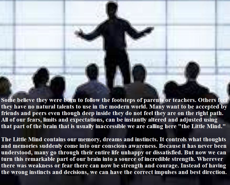 The Little Mind is the very misunderstood part of the brain referred to as the paleomammalian cortex. We are identifying a very different mind that thinks and acts independently of "us," the neocortex and frontal lobes, or the "rational mind." The mid-brain and stem areas control memory, emotion, hormone levels, immunity, automatic reactions, behaviors and intuition. This is a part of the brain we do not have access to under normal circumstances. But while dreaming the Little Mind is communicating to us. When we are driving but deep in thought about something else, the Little Mind is in control. When we receive an intuition out of nowhere; that is from the Little Mind. When are these worth following? The book "The Little Mind" describes the staggering ability of this part of the brain to transform or hinder.